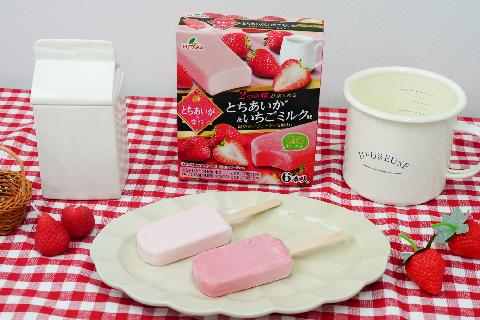 甘くフレッシュな味わいが特徴の「とちあいか」、いちごと相性抜群のミルクと組み合わせた「いちごミルク」の2つの味を1箱で一度に楽しめるマルチアイスです。