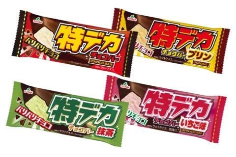 なめらかなバニラアイスとパリパリ食感のコーチングチョコを組みあわせた「特デカチョコバー」、まろやかなプリン味アイスとパリパリ食感のコーチングチョコを組み合わせた「特デカチョコバー プリン」、華やかないちご味アイスとパリパリ食感のコーチングチョコを組み合わせた「特デカチョコバー いちご味」、パリパリ食感のコーチングチョコとほろ苦い抹茶アイスを組み合わせた「特デカチョコバー抹茶」を、各2本ずつ計8本のセットでお届けいたします。