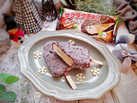 【ザクザクチョコティラミス】マスカルポーネとクリームチーズが入ったチーズアイスとほろ苦いエスプレッソコーヒーアイスの3層構造アイスを、ブラッククランチ入りチョコでコーチングしました。