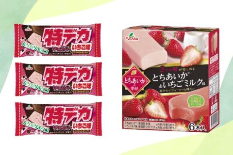 甘くフレッシュな味わいが特徴の「とちあいか」、いちごと相性抜群のミルクと組み合わせた「いちごミルク」の2つの味を1箱で一度に楽しめるマルチアイスです。